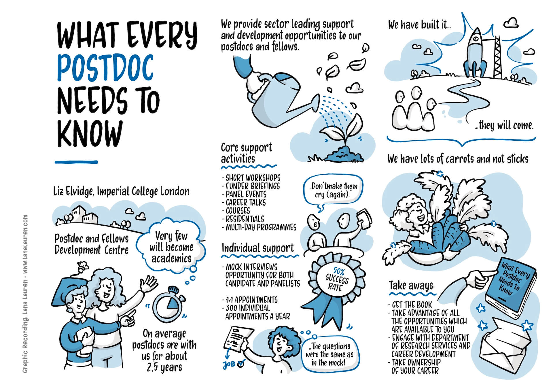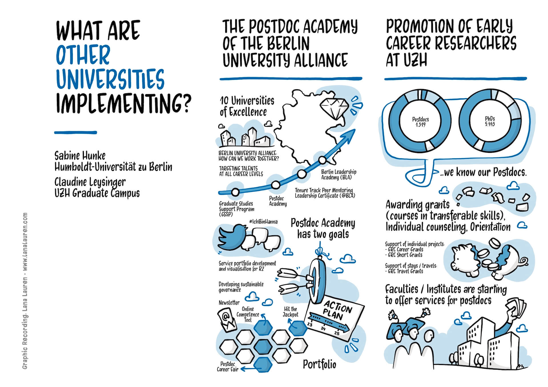 The Postdoc Conference at the University of Vienna was a wonderful opportunity for me to visually capture exciting ideas and discussions surrounding the questions, needs, and challenges of Postdocs and to dive into the topic. The conference took place on June 10th in the beautiful Sky Lounge of the university with a view over all of Vienna. I was there live, and my pen barely stood still – so many interesting impulses!