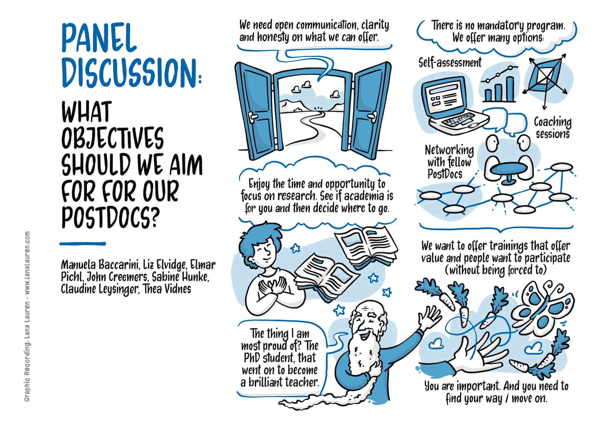 I found the vision of Vice-Rector Manuela Baccarini, to support Postdocs with tailored career offerings, particularly inspiring. A definite highlight was the statement “Being a Postdoc is not a Career” – a strong message. The international best-practice examples from London and Leuven also impressed me and provided discussion material, which I made visually tangible along with the presented concepts. The discussions about the situation in Austria and the political framework conditions also showed how much potential this topic holds. I captured all these ideas in my visuals and hope they help to make the University of Vienna’s vision for Postdocs vivid and lively.