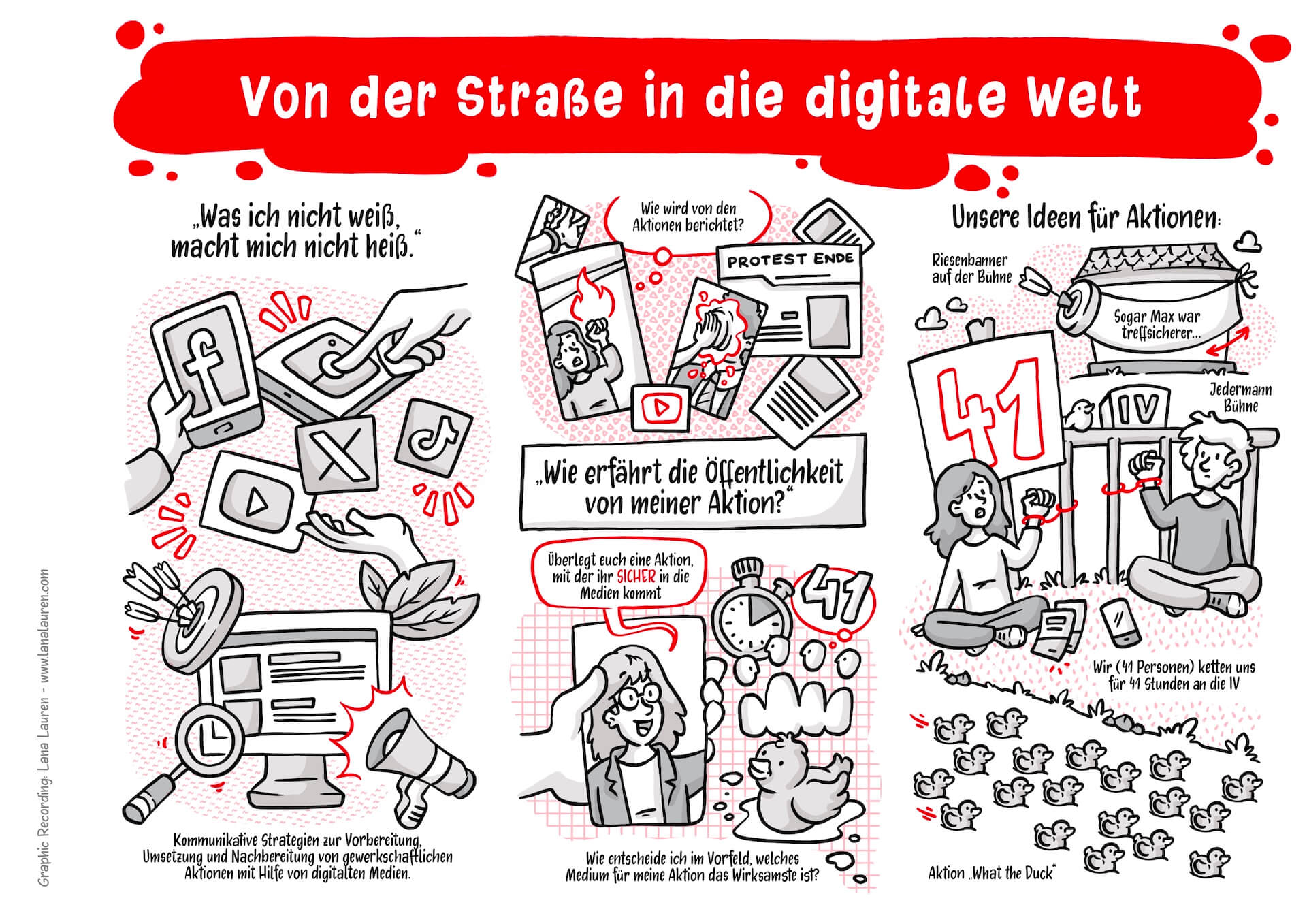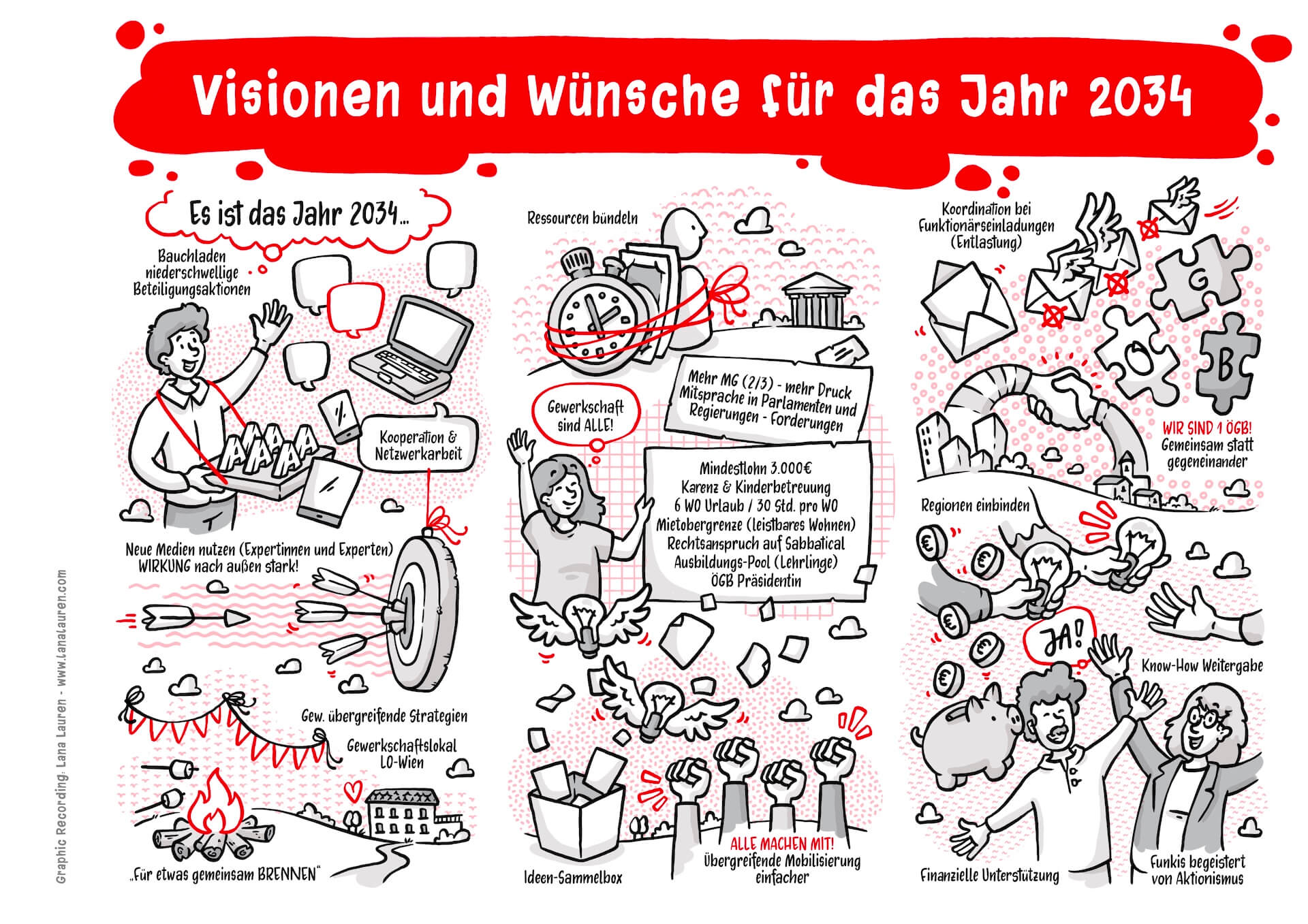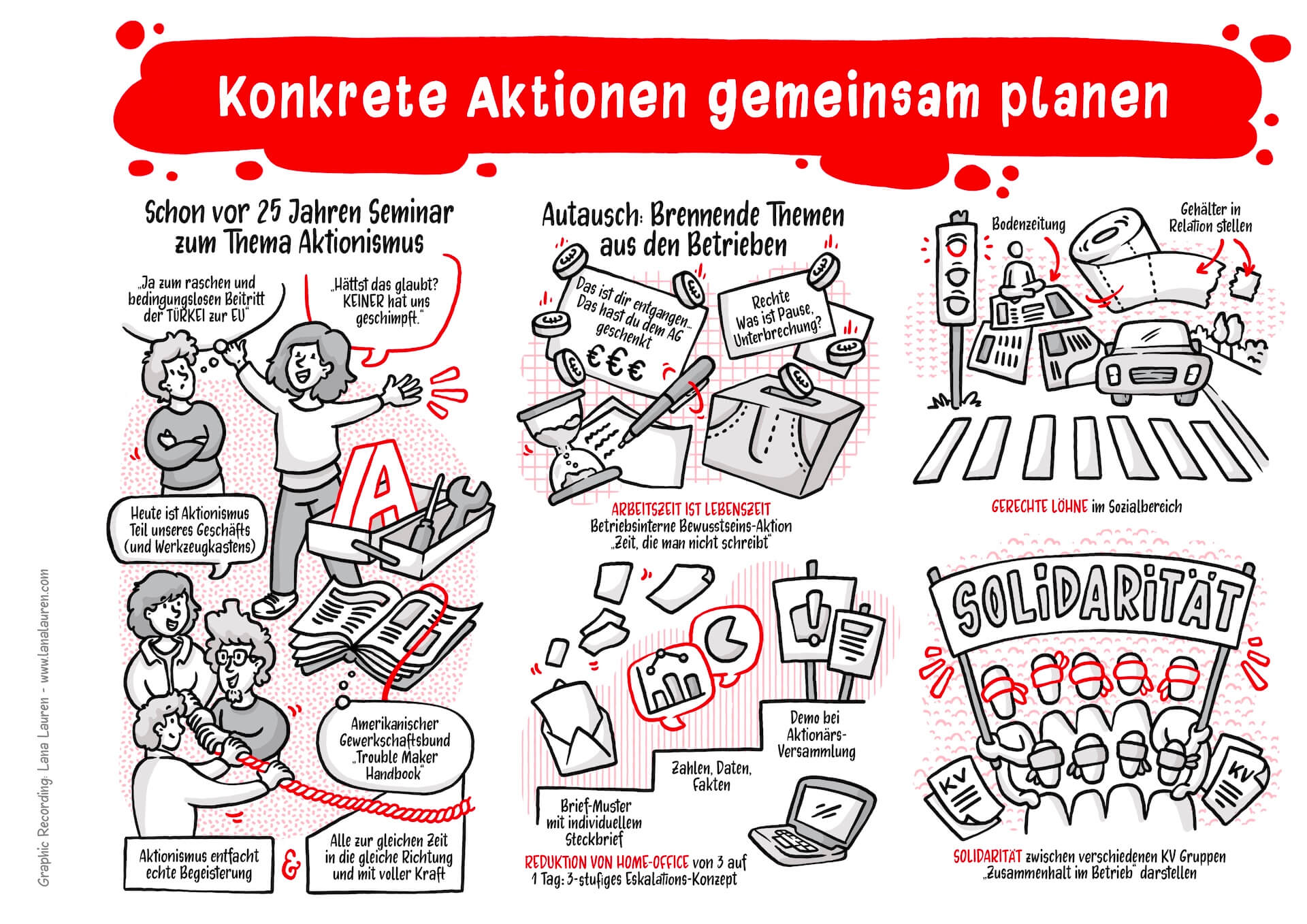 I visually accompanied the entire event and had the opportunity to dive into not only exciting but also very practical workshops. The illustrations not only supported the reflection on what was learned but also served as a conclusion and summary of the conference, motivating participants to apply creative approaches in their own union contexts in the future.
